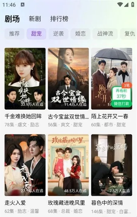 它能带来超棒的短剧观看体验。资源丰富多样,甜宠、逆袭、婚恋、复仇等各类风格短剧一应俱全,满足多样需求。画质清晰,播放流畅,免费播放无阻碍,随点随看超便捷。可随时将喜爱短剧加入收藏夹,方便回顾。无论身处何地,都能畅享丰富短剧内容,第一时间观看最新短剧,轻松上手操作,尽情沉浸在短剧世界中,感受别样精彩。