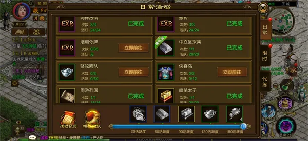 日常活动中有各种日常任务,中立区采集可以获得硬皮、秘银,周游列国奖励藏宝图有几率挖到硬皮、秘银,暗杀太子则可获得魂魄石,BOSS猎杀可获得秘银、硬皮、升级宝石。日常任务奖励的宝箱开启也有概率获得硬皮、秘银、魂魄石。完成日常任务会增加活跃度,达到一定活跃度即可领取秘银、硬皮、魂魄石、升级宝石奖励,日常任务每天一定要完成。