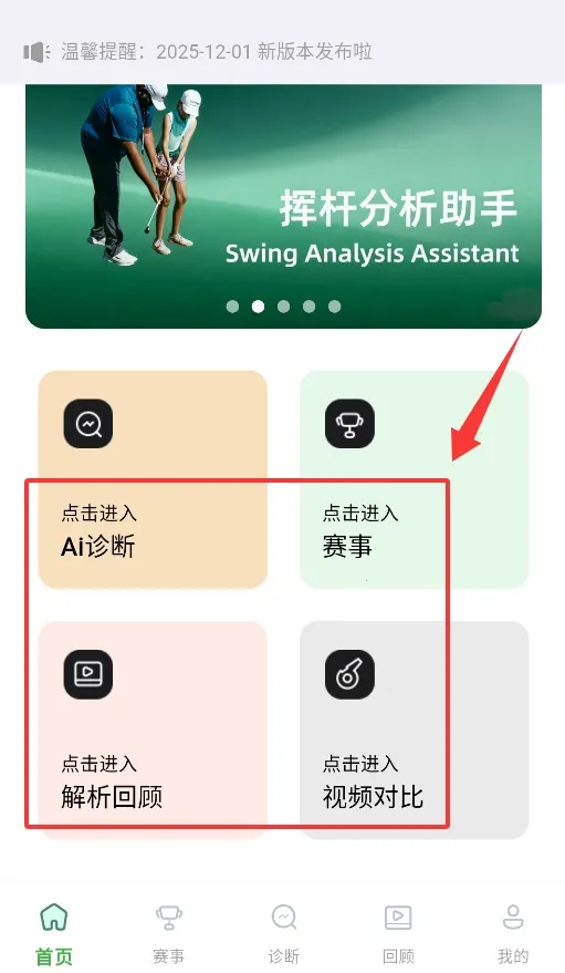 2、首页提供诊断、赛事、解析回顾、视频对比等功能入口。