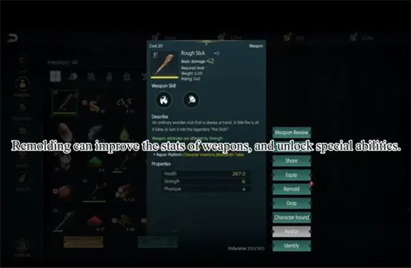 让我们以 Rough Stick 为例,通过重塑它,你可以提高它的基本伤害点数,它的生命值、力量和体质在你使用它时给你。