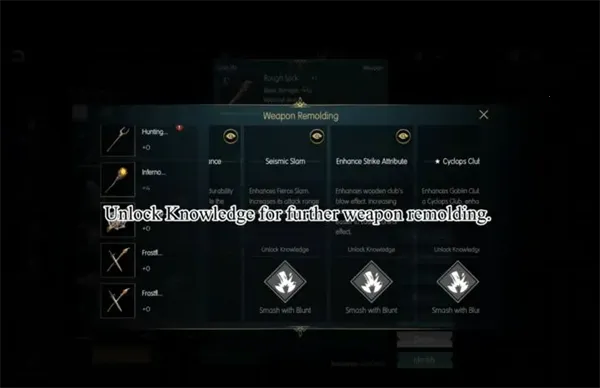 以 Rough Stick 为例,如果你想获得 Seismic Slam,你需要先解锁 Knowledge: Smash with Blunt。