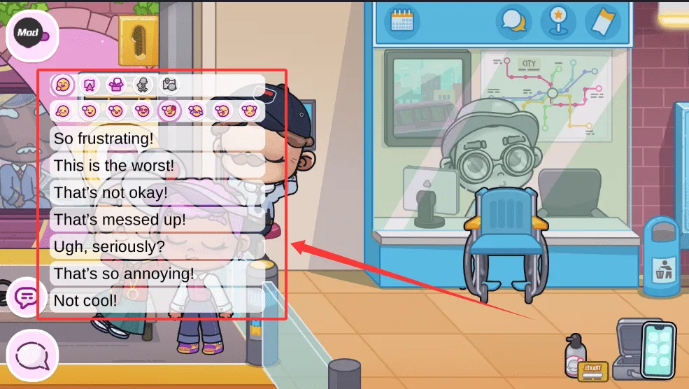 2、接着在聊天中如果遇到让人不满的情况,可以使用内置的情绪短语例如 So frustrating、That's not okay 来表达心情。