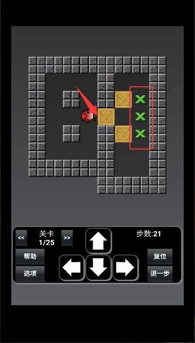 2、进入关卡后,通过点击屏幕上的方向按钮来控制角色移动。每次点击会让角色朝对应方向走一格,推动沿途的箱子。