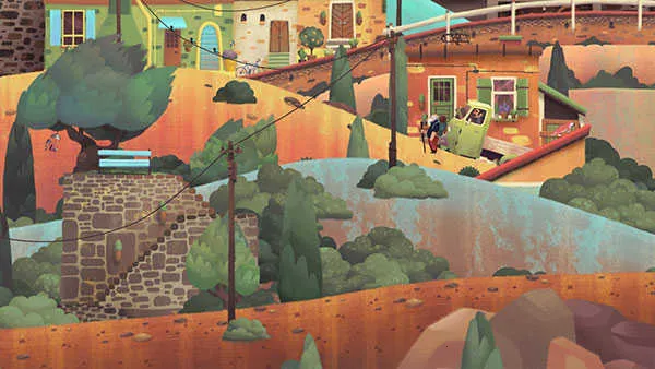 随后将蓝色坡道向上拉伸,打通前往村庄的道路。抵达村口即进入新场景。再将黄色道路下拉,引老人步入旅馆——他拾级而上,在窗边长椅坐下。点击街头流浪歌手,一辆旧车缓缓驶来接走他,老人闭目,记忆再次浮现……